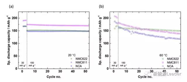 在鋰離子電池實(shí)際應(yīng)用中,材料的高溫穩(wěn)定性也是需要我們考慮的,Johannes Kasnatscheew對NMC622、NMC811和NCA材料在常溫和60 ℃下的循環(huán)性能做了研究,結(jié)果如下圖所示。一般而言,提高溫度可以改善電池內(nèi)的動力學(xué)條件,從而提高電池的性能,這一點(diǎn)從電池在60 ℃下的容量發(fā)揮可以明顯的看出來,但是高溫會對材料的循環(huán)穩(wěn)定性產(chǎn)生一定的影響。例如在20 ℃常溫下,三種材料在前50次循環(huán),具有比較接近的循環(huán)性能,但是將溫度提高到60 ℃后,NMC811和NCA材料循環(huán)50次后的容量保持率明顯低于NMC622材料,這表明NMC622材料具有更高的熱穩(wěn)定性。