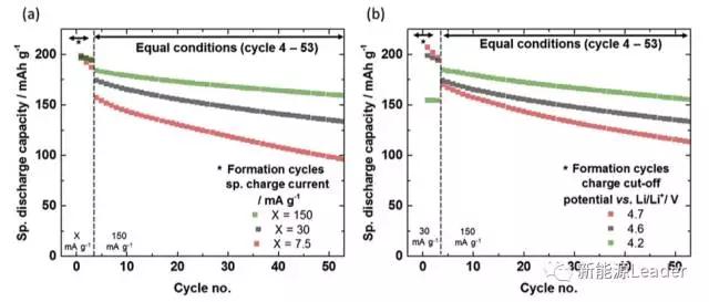 從上述的分析中我們也看到,NMC的脫鋰數(shù)量對于材料的循環(huán)壽命有很大的影響,而對于NMC材料而言,充電截止電壓越高,脫鋰數(shù)量越大,在充電截止電壓一定的情況下,電流越小,電池的脫鋰數(shù)量也就越大。在鋰離子電池的化成過程,一般而言會采用較小的電流充電到截止電壓,然后再進(jìn)行放電,因此化成過程中截止電壓和化成電流都會對NMC材料的循環(huán)性能產(chǎn)生影響。下圖為化成過程中的化成電流和截止電壓對材料循環(huán)性能的影響。從圖a可以看到,較小的電流可以獲得更高的容量,例如7.5mA/g的電流密度下NMC622材料的充電容量為234.8mAh/g,30mAh/g時(shí)充電容量為229.8mAh/g,150mA/g時(shí)充電容量為223.8mAh/g,但是在化成結(jié)束后的循環(huán)過程中,大電流化成的材料容量發(fā)揮反而更高,循環(huán)性能更好,表明材料的結(jié)構(gòu)更加穩(wěn)定。不同化成截止電壓對電池循環(huán)性能的影響如圖b所示,從圖上可以看到,隨著充電截止電壓的提高,材料的容量也快速升高,4.7V充電容量達(dá)到241mAh/g,而4.2V時(shí)NMC622材料的充電容量僅為180mAh/g,但是在化成后的循環(huán)過程中,化成電壓越高,容量發(fā)揮反而越低,循環(huán)性能越差。通過降低化成過程的電壓和提高化成電流,減少化成過程中三元材料脫鋰的數(shù)量可以有效的改善材料的結(jié)構(gòu)穩(wěn)定性,提升材料的循環(huán)性能。