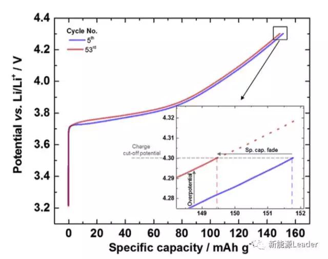 在鋰離子電池循環(huán)的過程中,由于材料結(jié)構(gòu)的破壞和SEI膜的生長,會引起電池內(nèi)阻和極化的增加,從而使的電池在充電和放電過程中的“過電勢”增大,從而造成電池充放電容量的下降,如下圖所示。可以看到由于“過電勢”的存在導(dǎo)致鋰離子電池過早的達(dá)到截止電壓,結(jié)束了充電,從而使得電池的容量下降。為了克服由于過電勢而導(dǎo)致的電池的容量衰降,Johannes Kasnatscheew提出了智能控制充電電壓的理念,也就是隨著電池循環(huán)的進(jìn)行,對充電電壓進(jìn)行調(diào)整,從而保證每次充電的容量都是一致的,克服由于過電勢造成的容量衰降,從而提高電池的循環(huán)性能(如下圖a所示)。該方法還要考慮到,隨著循環(huán)次數(shù)的增加,充電截止電壓會不斷的升高,應(yīng)該避免充電截止電壓超過該材料的安全電壓限制。