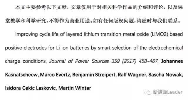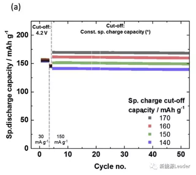 Johannes Kasnatscheew對影響三元材料循環(huán)性能的因素進(jìn)行了分析,例如充電截止電壓和化成的電壓和電流,以及環(huán)境溫度對NMC和NCA材料循環(huán)性能的影響,從本質(zhì)上來說隨著NMC材料脫鋰數(shù)量的增加,會導(dǎo)致材料的結(jié)構(gòu)穩(wěn)定性下降,影響循環(huán)性能。此外,高溫也會對材料的穩(wěn)定性產(chǎn)生負(fù)面的影響,從而導(dǎo)致材料循環(huán)性能下降。Johannes Kasnatscheew還根據(jù)NMC材料的特性,設(shè)計(jì)了一種全新的充電制度,既截止容量限制,對充電電壓進(jìn)行調(diào)整保證電池每次充電的容量都是相同的,從而克服由于電池過電勢導(dǎo)致的充電容量和放電容量的衰降,很好的改善了電池的循環(huán)性能。
