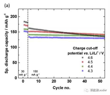 NMC材料的脫鋰數(shù)量與充電截止電壓成正比,也就是說充電截止電壓越高NMC材料的脫鋰量也就越大,相應(yīng)地材料的結(jié)構(gòu)也就越不穩(wěn)定。下圖為NCM811材料在不同的充電截止電壓下,循環(huán)性能曲線,可以看到提高截止電壓后,材料容量發(fā)揮明顯提高了,但是隨之而來的是材料衰降速度的加速。對比不同截止電壓下的循環(huán)數(shù)據(jù)后發(fā)現(xiàn),4.6V截止電壓時(shí)雖然在第五次放電時(shí)比容量最高,但是在循環(huán)53次后,其容量快速下降,低于4.5V和4.4V截止電壓下NMC111的容量。這表明一味的的提高充電截止電壓,雖然會使的材料的容量獲得較大的提升,但卻會使的材料的循環(huán)穩(wěn)定性發(fā)生明顯的下降,因此需要根據(jù)電池的設(shè)計(jì)壽命合理選擇充電截止電壓。
