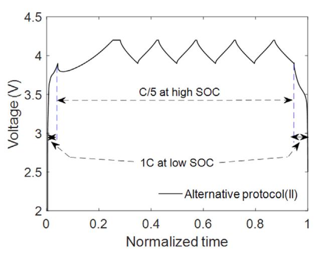為了壓縮化成時間,降低生產(chǎn)成本,美國橡樹嶺國家實驗室在1.5Ah的NCM/石墨軟包鋰離子電池上設(shè)計了一種快速化成的制度(如下圖所示),在這一制度下首先以較大的電流(1C)將鋰離子電池充電到3.9V,然后以C/5倍率在3.9-4.2V的范圍內(nèi)對鋰離子電池進(jìn)行充放電循環(huán),最后將電池放電到3.0V,相比于以0.05C倍率進(jìn)行3次循環(huán),該制度下電池的化成時間僅需要14h,化成速度提高8.5倍。這一化成制度的設(shè)計思路主要是將負(fù)極在較低電勢范圍內(nèi)時,充電電流盡量盡可能的小,以使負(fù)極形成更為致密和穩(wěn)定的SEI膜。