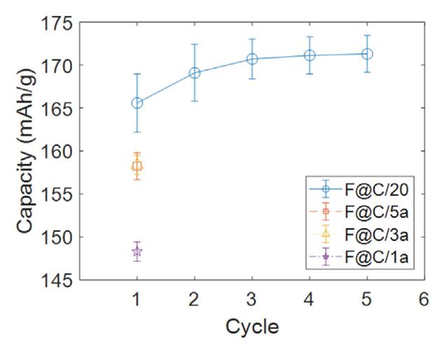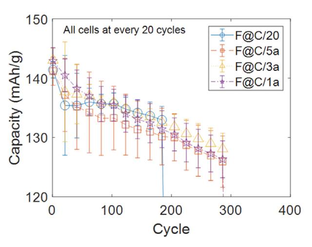 雖然不同的化成電流會導(dǎo)致不同的化成容量發(fā)揮,但是在循環(huán)過程中我們發(fā)現(xiàn)這些電池之間沒有明顯的差距,在1C/1C倍率下循環(huán)的幾種電池的容量發(fā)揮和循環(huán)穩(wěn)定性幾乎相同,表明不同電流下化成的電池,最終負(fù)極表面都形成了穩(wěn)定的SEI膜。因此作者認(rèn)為采用上述的分段式快速化成制度能夠在化成過程中部分的形成SEI膜,然后在鋰離子電池使用的前幾次循環(huán)中最終完成穩(wěn)定SEI膜的構(gòu)建,從而在大幅壓縮化成時間、降低成本的同時還能夠獲得相近的循環(huán)壽命。