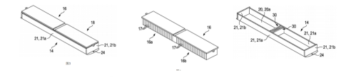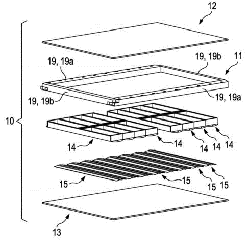 在下面的示意圖中,展示了八個電池模塊(模塊殼體)和(14)八個可彈性變形的元件。這個8個殼體往下細翻,可以看出PPE的模組設計方案,是建立在MEB的590基礎上的,這里設計的思路,是使用兩個橫向分割長度的模組,形成一個一體化結構的長模組設計,長模組之間含有中間隔板,將模組分為前后兩個部分。用專利的說法是,電池長模組包含了下面的長模組殼體,主要包含兩個對置的第一側板(長邊,我們通常成為側板) 和兩個對置的第二端板(窄邊),這兩個板相擰接。