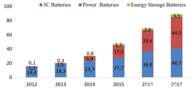 目前全球動力電池市場基本形成了中、日、韓三足鼎立的格局,其中中國是全球最具活力的動力電池市場,2017年中國市場動力電池產量達到了88.7GWh,年化增長率達到了29.3%,其中動力電池為44.5GWh,超越了傳統的3C消費電子,成為鋰離子電池市場的主力。