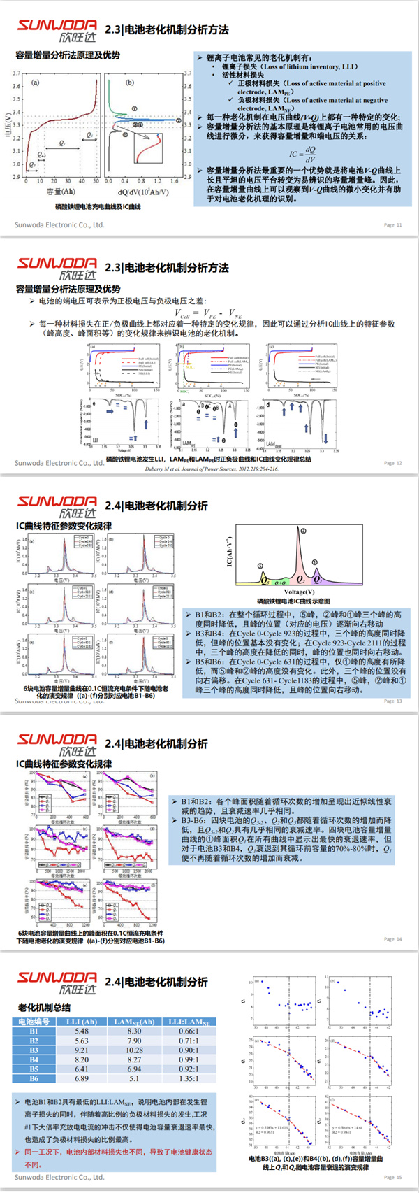 首先重點講解了磷酸鐵鋰電池老化機制分析方法,指出鋰離子電池常見的老化機制有: 鋰離子損失、活性材料損失 、正極材料損失、負極材料損失。另外,每一種老化機制在電壓曲線(V-Q)上都有一種特定的變化; 容量增量分析法的基本原理是將鋰離子電池常用的電壓曲線進行微分,來獲得容量增量和端電壓的關系:容量增量分析法最重要的一個優勢就是將電池V-Q曲線上長且平坦的電壓平臺轉變為易辨識的容量增量峰。因此,在容量增量曲線上可以觀察到V-Q曲線的微小變化并有助于對電池老化機理的識別。