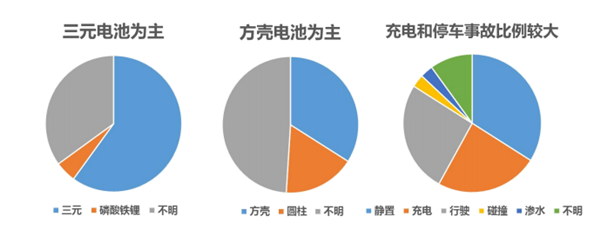 2019年以來電動汽車自燃起火事故仍然頻發。據不完全統計,截至2019年1-7月,國內外媒體所報道的與動力電池相關的電動汽車安全事故達到40余起;2020年4-5月也是發生了多起電動汽車自燃起火事故。姜久春表示,從電池材料體系來看,相當多的事故車輛配備了三元鋰離子電池。從電池形狀來看,較多的事故來自于方殼電池。另據發現,事故發生時電動汽車處于停置、行駛和充電這三種狀態的比例基本相當。高比能量密度電池在提高車輛續航里程的同時也加劇了電動汽車電池相關的安全事故。