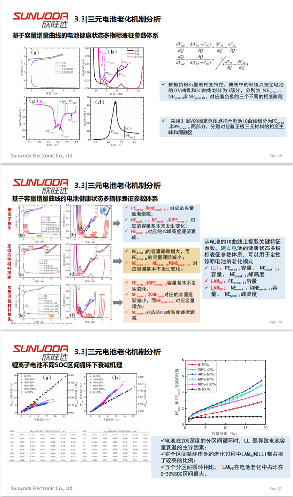 其次著重講解了三元電池老化機制分析。其中指出鋰離子電池不同SOC區間循環下衰減機理:電池在20%深度的分區間循環時,LLI是導致電池容量衰退的主導因素;在全區間循環電池的老化過程中LAMPE和LLI都占據了較高的比例;五個分區間循環相比, LAMPE在電池老化中占比在 0-20%SOC區間最大。