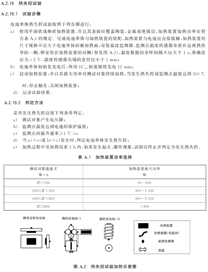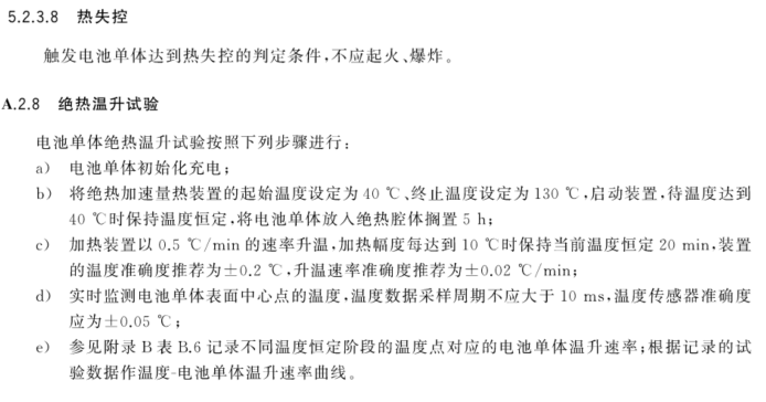 相對于動力型鋰離子電池來說,新增了電池單體的絕熱溫升測試試驗和熱失控試驗,以及電池模塊的熱失控擴散試驗。