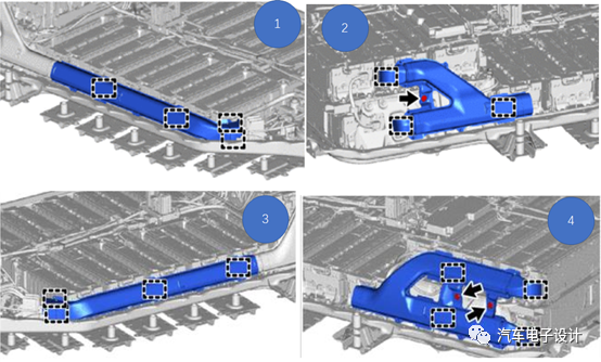 在設計中,把風道沿著電池包兩側進行布置,風道的空間被用作側面撞擊時的緩沖區,起到一定的防護。風道一共分為四個部分,如下圖所示: