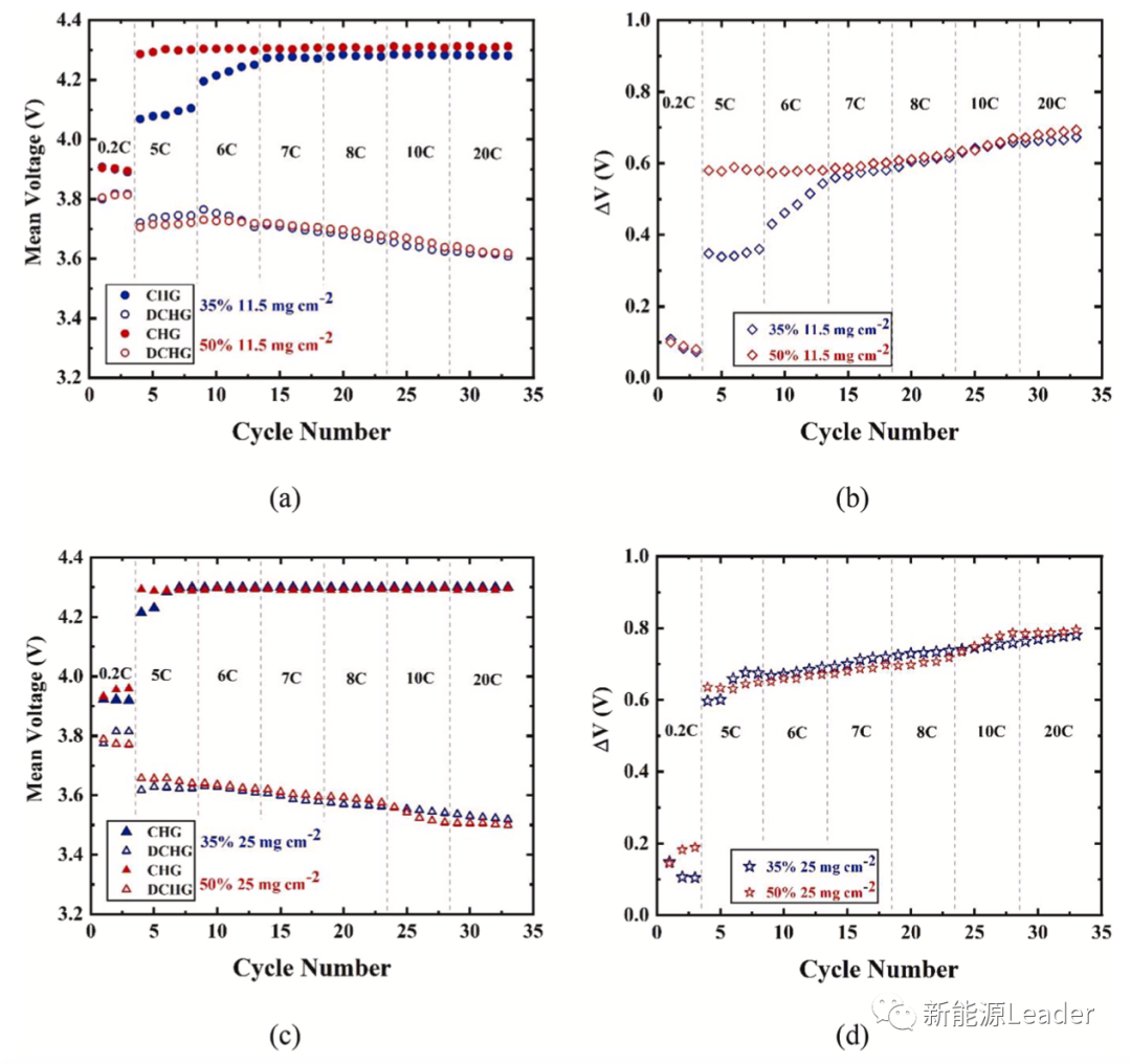 下圖為不同涂布量和孔隙率的電極在不同倍率下的平均充放電電壓和充放電電壓之間的差值的變化曲線。從下圖a可以看到在11.5mg/cm2的涂布量下,在0.2C較低倍率下,高低孔隙率的電極的充放電平均電壓基本上式相同的,當倍率達到5C和6C時,能夠觀察到35%孔隙率的電極具有更低的充電平均電壓。當電極的涂布量達到25mg/cm2時,在0.2C倍率下孔隙率為35%的電極具有較低的充電平均電壓和較高的放電平均電壓,但是在5C和6C倍率下,兩種孔隙率電極極化都比較大。從下圖b可以看到兩種孔隙率的電極對于充放電之間的電壓差有著明顯的影響,在5C倍率下50%孔隙率的電極電壓差為0.57V左右,而35%孔隙率的電極的電壓差則僅為0.36V,但是在更高倍率下這種差距基本消失。在25mg/cm2的涂布量下,兩種孔隙率的電極這種差距則基本消失,這可能是因為低涂布量的電極的擴散長度接近特征擴散長度,因此孔隙率降低帶來的擴散長度的減少有利于提升倍率性能,但是在較高的涂布量下,擴散長度較長,因此孔隙率變化引起的擴散長度的變化,對于電極的倍率性能的影響較小。