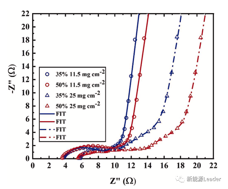 上述的測試表明,Li+在厚電極內的擴散過程可能是電池快充能力的限制環節,在下圖中作者采用EIS工具對不同涂布量和孔隙率的電極進行了分析,作者認為在下圖中EIS曲線與X軸的交點為歐姆阻抗,半圓則為正極和集流體的接觸阻抗,半圓后的45度斜率的曲線為電解液在多孔電極內的擴散曲線,后面更大斜率的曲線則為Li+的固相擴散過程。
