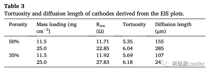 根據電極的EIS曲線可以看到,高涂布量會導致電極的歐姆阻抗增加,這主要是因為厚電極會增加Li+的擴散距離,而擴散距離L我們可以通過下式進行計算,下表為計算結果。從結果可以看到涂布量從11.5mg/cm2增加到25mg/cm2,擴散距離L增加了基本上一倍左右,同時電極的孔隙率降低也能夠有效的降低Li+在電極內的擴散距離。這表明較低的孔隙率雖然會導致電極的迂曲度增加,但是由于電極的厚度變薄,Li+的擴散距離降低,因此反而使得電池的倍率性能得到改善。