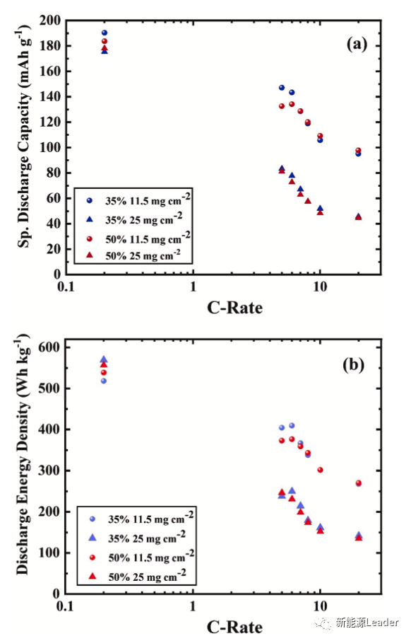 下圖展示了涂布量為11.5和25mg/cm2,電極孔隙率為50%和35%的電極的電性能,從下圖a中可以看到涂布量對于電極倍率放電的能力有著顯著的影響,涂布量較厚的電極在大倍率下的放電容量要明顯低于涂布量較低的電極。從下圖b可以看到在電極的能量密度方面,在0.2C倍率下厚電極能量密度更高,但是在較高的放電倍率下,反而是涂布量較薄的電極具有最高的能量密度,例如11.5mg/cm2的電極在5C和6C的倍率下電極的能量密度仍然可達405Wh/kg,遠高于厚電極的250Wh/kg。