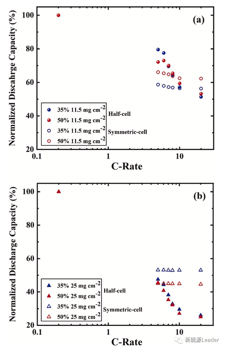 下圖中作者對比了扣式半電池和對稱式扣式電池的容量,從下圖a中可以看到在較低的倍率下對稱式扣式電池的容量較低,這主要是因為對稱式電池的正負極采用的均為多孔NCM622正極,因此整體上Li+的擴散距離要明顯高于采用金屬鋰片的半電池,但是在倍率大于8C時對稱式電池則表現出一定的優勢,而25mg/cm2的電極則在5C以上倍率時,對稱式電池就表現出明顯的優勢,這表明在大倍率下金屬鋰負極也會成為電池倍率性能的限制因素。