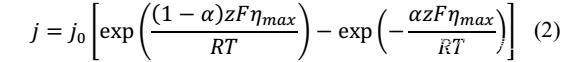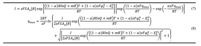 BV公式是最重要的電化學(xué)動(dòng)力學(xué)公式,主要描述了電流密度與穩(wěn)態(tài)過(guò)電勢(shì)之間的關(guān)系(如下式所示),其中j為電流密度,j0為交換電流密度,α為對(duì)稱系數(shù),ηmax為穩(wěn)態(tài)電化學(xué)過(guò)電勢(shì)。