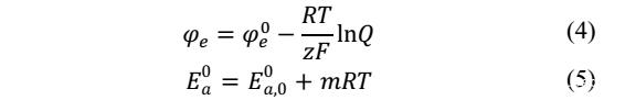 根據(jù)Nernst公式,φe可以采用下式4進(jìn)行表征,Ea0則可以通過(guò)下式5表征為溫度的函數(shù),m為一個(gè)無(wú)關(guān)溫度的常數(shù)。