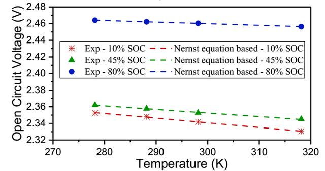 在下圖中作者分別根據(jù)Nernst方程計(jì)算了電池在10%、45%和80%SoC狀態(tài)下電池的開(kāi)路電壓與溫度之間的關(guān)系,可以看到計(jì)算結(jié)果與實(shí)際結(jié)果符合的非常好。
