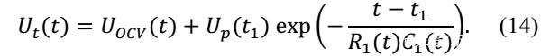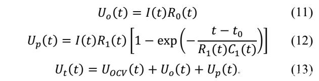 在靜置條件下電池的開(kāi)路電壓可以用下式進(jìn)行描述,在模型中作者對(duì)于電容C的數(shù)值沒(méi)有進(jìn)行專門(mén)的設(shè)計(jì),這主要是因?yàn)殡娙軨的數(shù)值對(duì)于模型準(zhǔn)確性的影響較小,因此作者將RC并聯(lián)電路的時(shí)間常數(shù)固定在15s。模型中與SoC相關(guān)的參數(shù)1, 2, 3, 1, 2, 3, 4, 1 2則是根據(jù)最小二乘法擬合利用線性插值的方式獲得。同時(shí)由于作者假設(shè)忽略濃差極化的影響,但是在充放電末期時(shí)濃差極化較為顯著,因此不能不忽略,因此該模型僅適合模擬電池在10%-90%SoC范圍內(nèi)電池的行為。