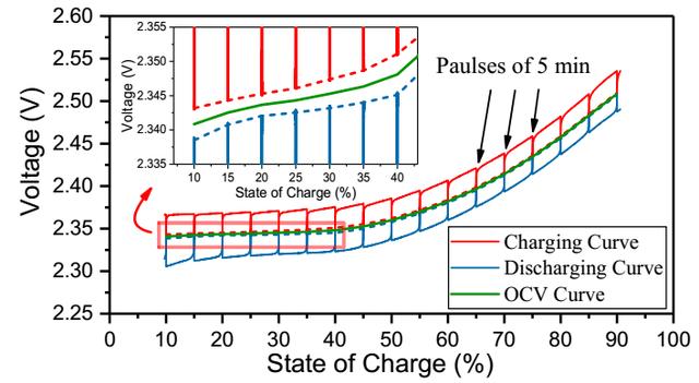 等效電路模型的首先要做的工作就是確定電池的開(kāi)路電壓,下圖中展示了快速測(cè)量鈦酸鋰電池開(kāi)路電壓的方法,電池以1C倍率進(jìn)行充放電,每5%SoC電池靜置5min,然后根據(jù)充電和放電電壓作者得到了下圖中綠線所示的開(kāi)路電壓曲線。