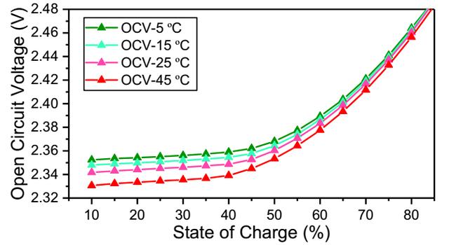 接下來(lái)作者分別測(cè)試了在5℃、15℃、25℃和45℃下的開(kāi)路電壓,如下圖所示
