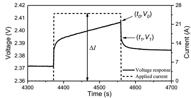 下圖為電池在放電過(guò)程中靜置期間的電壓變化,我們可以根據(jù)電流變化瞬間引起的壓降計(jì)算電池的歐姆阻抗(如下式所示),這里兩次取樣時(shí)間的間隔設(shè)定為1s,這主要是因?yàn)殡姵氐臉O化通常需要數(shù)十秒,甚至是數(shù)百秒的時(shí)間達(dá)到平衡,因此在1s的時(shí)間內(nèi)電池的極化不會(huì)發(fā)生顯著的變化,因此此時(shí)的電壓變化主要來(lái)自于電池的歐姆阻抗。