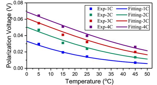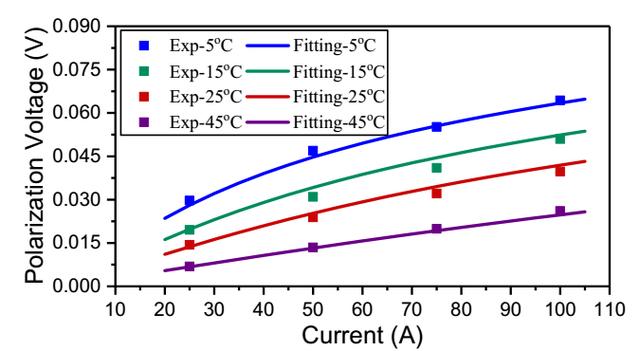 在上面我們已經(jīng)獲得了電池的開(kāi)路電壓和歐姆阻抗R0,因此我們可以根據(jù)上式16來(lái)計(jì)算電池的穩(wěn)態(tài)極化電壓,在這里作者采用了恒流充電過(guò)程中的數(shù)據(jù),以確保電池的極化達(dá)到穩(wěn)態(tài)。下圖分別為電池在不同的溫度下以不同的電流進(jìn)行充放電的極化電壓數(shù)據(jù),從圖中能夠看到溫度和電流對(duì)于電池開(kāi)路電壓的影響是呈現(xiàn)非線性的關(guān)系,作者在這里采用修正的BV公式獲得了擬合結(jié)果,從圖中能夠看到仿真結(jié)果與實(shí)測(cè)結(jié)果最大誤差約為2.2mV。