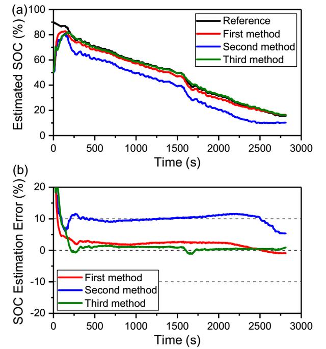 下圖為作者在5℃下采用FUDS循環(huán)對(duì)模型預(yù)測(cè)電池SoC狀態(tài)預(yù)測(cè)的結(jié)果,其中第一種方法時(shí)基于修正后的等效電路模型,以及卡爾曼濾波函數(shù),第二種方法時(shí)基于傳統(tǒng)的等效電路模型和卡爾曼濾波函數(shù),第三種方法是基于一維等效電路模型和雙卡爾曼濾波函數(shù)。從下圖的預(yù)測(cè)結(jié)果可以看到第一種和第三種方法都取得了較高的預(yù)測(cè)精度,其中第一種方法的誤差為-0.99%至3.02%,第三種方法的預(yù)測(cè)誤差在-1.13%至1.51%,而第二種放大的誤差則達(dá)到了5.34%至11.6%之間,三種方法的平均誤差分別為1.82%、9.89%和0.68%,可以看到修正的等效電路模型對(duì)于SoC狀態(tài)的預(yù)測(cè)取得了較高的精度。