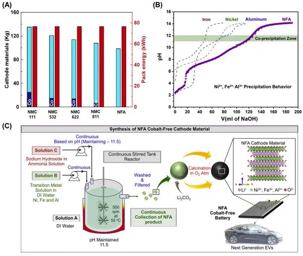 圖1.(A)行駛相同260英里路程所用正極材料及其鈷含量的比較;(B)Ni2+、Fe2+和Al3+等沉淀行為和NFA中三元素共沉淀的比較;(C)NFA制備過程示意圖