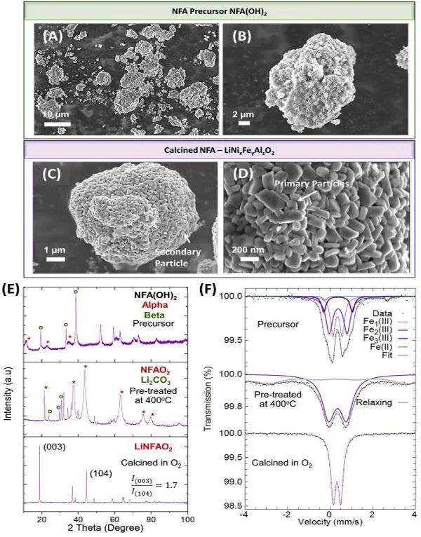 用掃描電子顯微鏡(SEM)對合成的前驅體粒子和最終的正極粉末進行形貌表征。圖2(A)中所示的SEM表明,氫氧化物前驅體呈球形,前驅體的平均粒徑約為10 μm。可以觀察到,氫氧化物前驅體的表面呈現沙玫瑰型圖案(圖2(B)),與傳統的NCM和NCA類似。前驅體粒子經碳酸鋰煅燒后的SEM如圖2(C)和2(D)所示。煅燒后的粉體由球形形貌的二次粒子組成。作者通過對共沉淀和煅燒工藝參數的進一步優化,將更好地控制材料的形貌和成分。圖2(E)所示為合成前驅體、400℃預處理中間體和最終正極粉末的X射線衍射圖。NFA氫氧化物前驅體的XRD圖表明,前驅體中α和β兩種晶相共存。然而,NFA氫氧化物前驅體的衍射圖與由α-Ni(OH)2(ICDD-00-038-0715)和β-Ni(OH)2(ICDD-00-059-0462)XRD圖相似。然后將前驅體與Li2CO3混合,并在空氣中于400℃下加熱以煅燒掉前驅體中的氫氧化物。預處理前驅體的XRD圖表明,前驅體的氫氧化物完全轉化形成了巖鹽NFAO2型晶體。在預處理之后,正極粉末重新研磨并在氧氣氣氛中煅燒,以促進鋰嵌入NFAO2晶格結構形成最終正極粉末LiNFAO2。圖2(E)的衍射圖說明這些材料形成了含有少量碳酸鋰雜質的結晶度較高的正極粉末。可以看到(006),(102)和(108),(110)等峰出現分裂,表明形成的是層狀α-NaFeO2型晶體結構。通過(003)和(104)的峰強度對比來確定層狀正極材料中陽離子混排程度,(003)和(104)的峰強度比為1.7,說明陽離子混排程度不明顯。根據精修參數和占位率,確定正極材料的成分為Li1.0Ni0.85Fe0.052Al0.091O2。由于鐵是NFA體系的組成元素之一,穆斯堡爾譜可進一步對材料進行表征。穆斯堡爾譜學能夠確定鐵的氧化態、價鍵和晶體位置。光譜圖(圖2(F))說明前驅體和最終正極材料粉末是順磁性的,經過400℃預處理的中間材料的光譜較為復雜,但是沒有磁性雜質譜。前驅體有較寬的譜圖分布,至少需要三個組分來對應三價鐵的譜圖中心部分。此外,還觀察到少量高自旋二價鐵。400℃預處理后,光譜的中心部分較簡單,但也更寬,說明較大部分鐵顯示出非常寬的光譜,推測與無序磁相有關。700℃下煅燒后,光譜圖變尖銳,表明是單一的三價鐵組分,說明煅燒后小部分二價鐵被氧化。峰強度變弱說明,原本分布廣泛的鐵向一個較窄的圖譜范圍內演變。因此,可以推斷出煅燒過程中可能是促進結晶,也可能是促進大晶粒的生長。