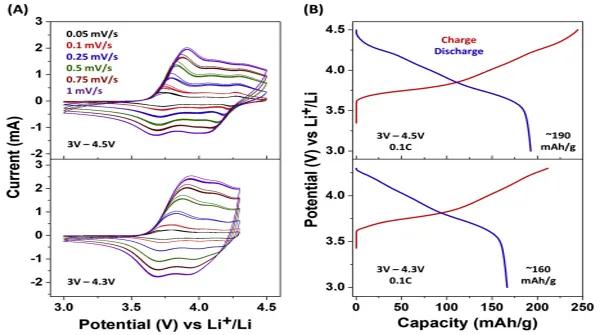 通過組裝NFA正極材料的2032型扣式半電池測循環伏安和恒流充放電試驗。在3.0 V–4.5 V和3 V–4.3 V電壓窗口之間,以0.1 mV/s–1 mV/s的掃速進行CV測試(圖3(A))。在3 V–4.5 V較大電壓窗口范圍內,分別于~3.75 V,4.0 V和~4.25 V出現明顯的脫嵌鋰峰。脫嵌峰類似于晶型轉變:(i)六邊形-1→單斜(~3.75 V),(ii)單斜→六邊形-2(~4.0 V)和(iii)六邊形-2→六邊形-3(~4.25 V)。從六邊形2到六邊形3的轉變是層狀正極材料容量發生衰減引起的。兩個電壓窗口中的CV測試表明,在所測的掃速中,NFA正極具有較好的電化學可逆性。圖3(B)是NFA正極在兩個電壓窗口中的恒流充放電試驗。這種無鈷正極材料在0.1C充放電倍率下,在3 V–4.5 V電壓范圍內容量可達到190 mAh/g,在3 V–4.3 V電壓范圍內容量為160 mAh/g。