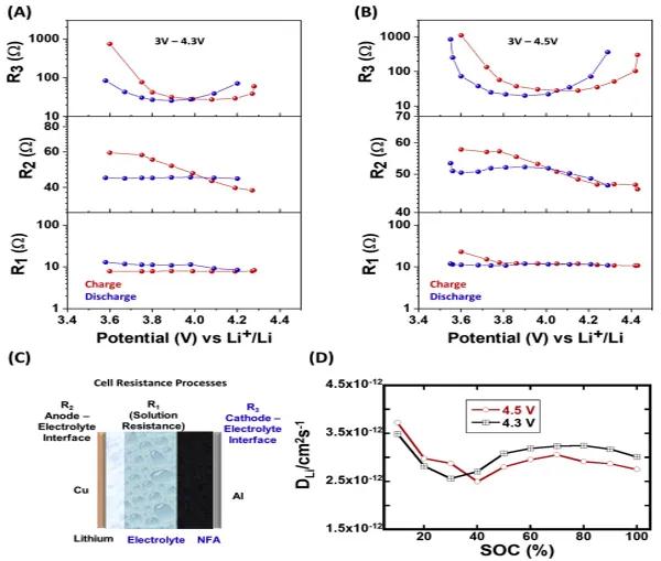 圖4(A)和4(B)反應了電池阻抗隨電壓的變化。圖4(C)中的示意圖說明了R1、R2、R3各阻抗的意義。結果表明,R2隨著脫鋰度的增加逐漸減小,直至3.7V左右,此后,即使進一步脫鋰,其電阻也幾乎保持不變。R3電阻值隨著充電至3.9 V逐漸減小,此后,隨著脫鋰程度的加深,電阻變大。此結果表明,NFA正極活性粒子的電子電導率和離子擴散的變化引起了正極-電解質界面電荷轉移。鎳在NFA中的初始價態為+3,氧化后逐漸轉變為Ni4+。Ni3+/Ni4+的混合價態濃度隨著進一步脫鋰的增加而增加,并形成一個導電網絡。進一步脫鋰后,Ni3+濃度降低,Ni4+增加,導電網絡逐漸破裂。因此,正極電解液界面電阻R3表現出這一趨勢。從圖4A和B也可以觀察到,隨著SOC的增加,R2略有增加。這歸因于層狀材料在脫鋰初期電子導電性急劇增加,最初導致R2較小。另外,當鋰濃度較高時,R3較大。在完全鋰化階段,材料的電子導電率相對較低。所得EIS結果可能說明界面電荷轉移電阻是一個倍率限制因素,特別是在高鋰濃度區間。圖4(D)為SOC和鋰離子擴散系數之間的關系。40%SOC前離子擴散速率急劇下降,然后逐漸增加至70%SOC。在70–100%SOC范圍內,擴散速率開始緩慢下降,隨后呈上升趨勢。在較高的鋰濃度區間,擴散系數較高。在兩個電壓窗口中,材料的離子擴散率隨鋰含量的變化趨勢相似。離子在這些材料中的擴散可以通過間隙位或空位發生。在間隙型擴散機制中,離子擴散速率通常隨脫鋰程度的增大而降低,在空位型機制中,離子擴散率隨著脫鋰程度的增加而增加。從所得到的擴散速率趨勢圖來看,NFA正極表現出間隙型擴散機制。在中等鋰濃度范圍內,空位機制可能是活躍的,在脫鋰程度較高時,空位有序化可能起到降低擴散系數的作用。盡管如此,NFA正極在兩個電壓窗口中的擴散系數均在3.5×10-12~2.5×10-12 cm2/s之間。所得結果與傳統層狀正極材料的結果一致。這些結果表明,在較高的循環倍率下,離子擴散速率可能是一個重要的倍率限制因素。