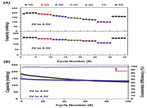 圖5(A)是兩個電壓窗口范圍內的倍率性能圖。在3 V–4.3 V的電壓范圍內,該材料表現出良好的倍率性能,在0.1C時容量約為160 mAh/g,1C倍率時容量降低為約30%。在3 V–4.5 V較大電壓范圍內,該材料在0.1C下時的容量約為190 mAh/g,1C倍率時,其容量降低了約40%。另外,通過C/3倍率在兩個電壓范圍內進行充放電循環測試。循環曲線圖如圖5(B)所示。3 V–4.5 V較高電壓窗口下,材料容量約為180 mAh/g,隨著循環次數的增加,其容量逐漸衰減。經過100次循環后,容量約為初始容量的70%。當電壓窗口為3 V–4.3 V時,正極材料最初的容量稍低,約為150 mAh/g。此外,正極在兩個電壓窗口下的庫侖效率都在99%左右。3 V-4.3 V電壓窗口C/3倍率下循環100次后容量保持率約88%。這是因為在較高電壓范圍內循環時,富鎳材料中發生的六邊形-2至六邊形-3的相變導致容量衰減。