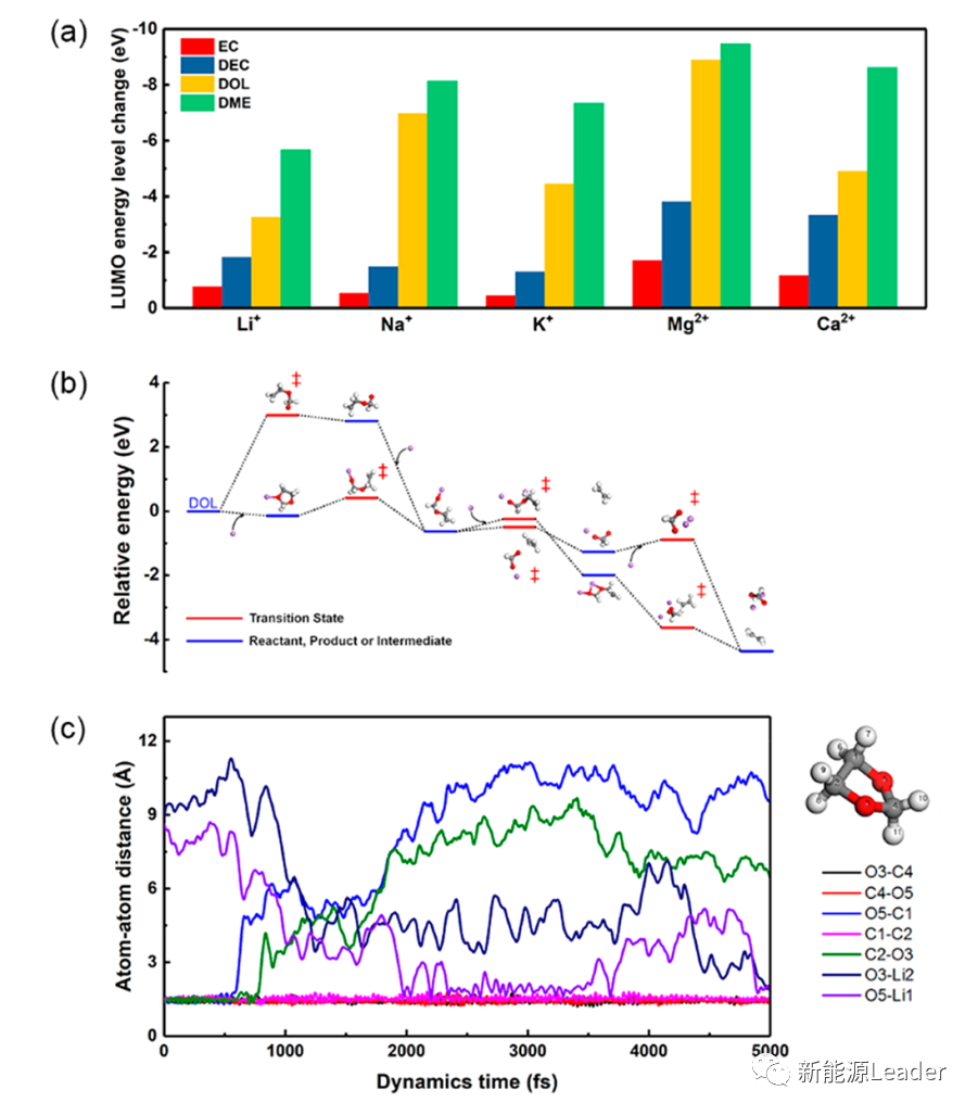 當分子與陽離子結合后,陽離子會吸引分子中的電子,從而使得分子的LUMO能量進一步降低,因此在陽離子溶劑化外殼結構中的分子更容易在負極表面的電子,發生還原分解反應,這也導致了電解液相對于純溶劑更容易發生還原分解。除了對分子的熱力學分析以外,人們也利用分子動力學工具從動力學角度進行了分析,以DOL溶劑為例,在與Li+溶劑化以后,其開環反應的能壘從3.0eV降低到了0.56eV,因此在電解液中溶劑會更為容易發生分解反應。