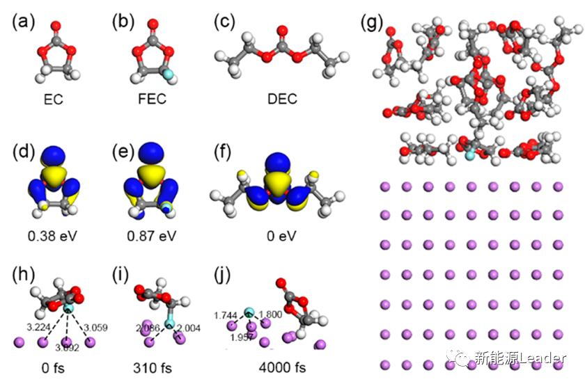 在電解液中不容的溶劑具有不同的特性,例如FEC相比于EC和DEC就具有更低的LUMO能量,因此更加容易在負極得電子發生分解反應。同時FEC也更容易與Li+形成溶劑化結構,從而使得FEC的LUMO能量進一步降低,因此在金屬鋰負極一側,FEC更加容易與金屬鋰發生反應,生成一層富含LiF的界面膜,通常我們認為這層界面膜能夠更好的穩定金屬鋰負極,提升金屬鋰電池的循環穩定性。