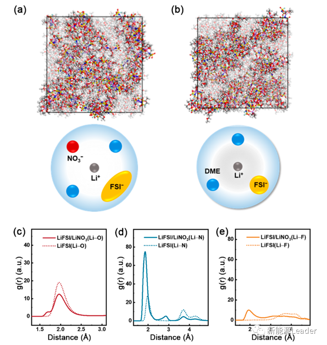 通過調控溶劑化外殼中陰離子能夠控制鋰鹽的溶解性和界面特性,例如NO3-與Li+具有更大的結合能,并且能夠同時與兩個Li+結合,因此能夠形成更大的團簇。更為重要的是,NO3-的引入還會對Li+與FSI-的結合方式產生影響,在不含NO3-時,FSI-通過Li-O和Li-N鍵與Li+進行結合,但是引入NO3-后,FSI-還會通過Li-F鍵進行結合,從而促進在負極形成富含LiF的SEI膜,改善金屬鋰電池的循環穩定性。