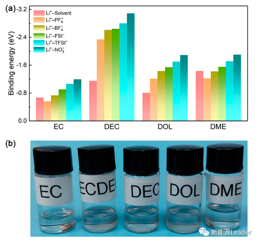 Li+與陰離子和溶劑分子的結合能力的競爭對于鋰鹽的溶解會產生顯著的影響,例如PF6-與Li+的結合能要明顯的弱于其他陰離子(BF4-、FSI-、TFSI-、NO3-),因此相比于其他鋰鹽,LiPF6在碳酸脂類溶劑中具有非常優異的溶解性。BF4-由于與Li+之間存在較強的相互作用,因此在有機電解液中溶解性較差。FSI-、TFSI-雖然也與Li+存在較大的結合能,但是由于其較大的離子半徑,因此溶解過程中存在較大的熵變,因此促進了溶解過程的進行,使其也具有了較好的溶解度。而NO3-與Li+之間具有非常強的相互作用,因此在多數的電解液體系中LiNO3的溶解度都極低。在溶劑中DME兩個具有電負性的氧能夠同時與Li+成鍵,因此DME能夠與Li+產生極大的結合能,因此DME是一種理想的鋰鹽溶劑(包括LiNO3),同時由于DME具有較低的介電常數,因此Li+與陰離子之間的結合并未被顯著的削弱。