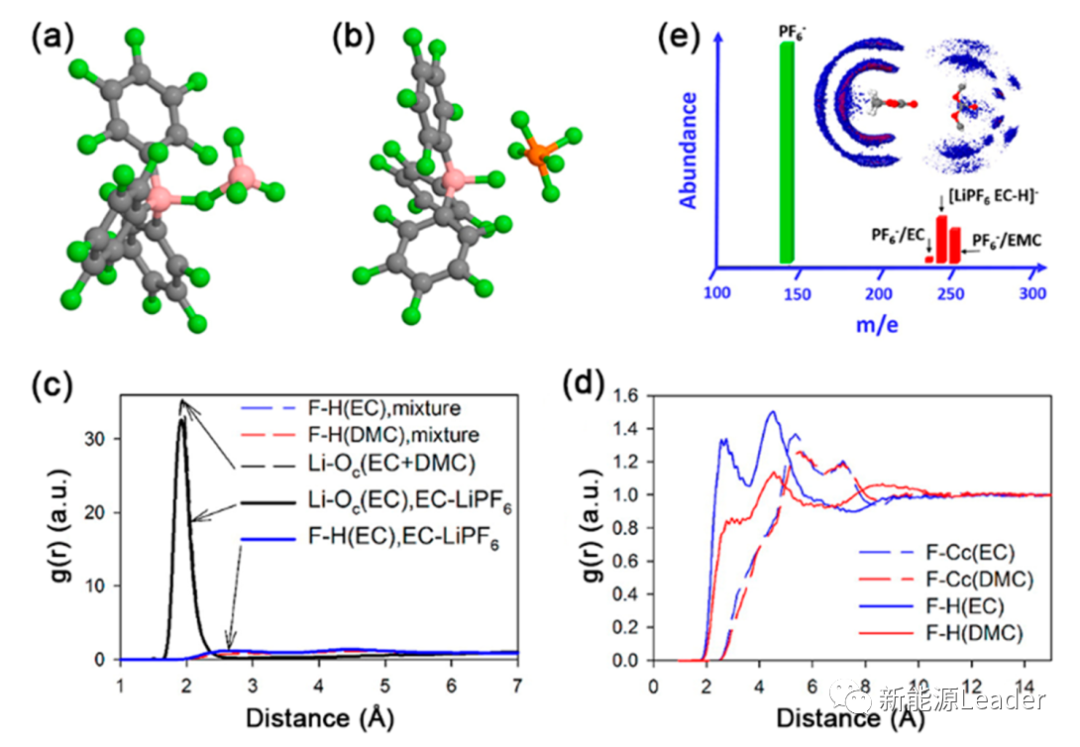 通常我們認為具有更多的受體數或者裸漏正電荷位置的溶劑分子能夠與陰離子形成強的相互作用,例如三(五氟苯基)硼烷(TPFPB)中的B元素作為電子受體,BF4−和PF6−形成較強的相互作用。此外,陰離子也更傾向與環狀溶劑結合,因為環狀溶劑具有更強的極性。但是由于陰離子與溶劑分子之間較弱的作用力,因此我們仍然很難定義陰離子的溶劑化外殼。但是我們仍然能夠從理論上對陰離子溶劑化的影響進行分析 ,首先溶劑分子與陰離子發生溶劑化之后,氧化穩定性降低,還原穩定性提高,其次溶劑化后會使得陰離子的遷移速度降低,從而提升電解液的遷移數,有利于鋰離子電池倍率性能的提升。第三是陰離子溶劑化之后,能夠促進鋰鹽的溶解,提升鋰鹽的濃度;最后,在陰離子溶劑化之后,Li+-溶劑化結構會發生改變,從而對電解液的結構和界面反應產生影響。