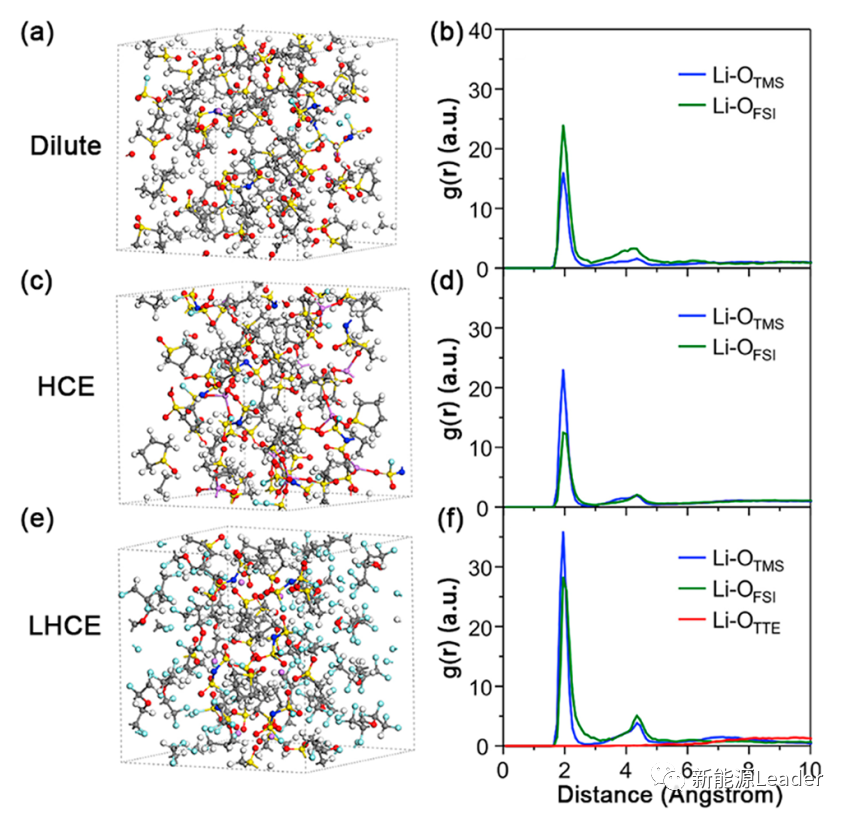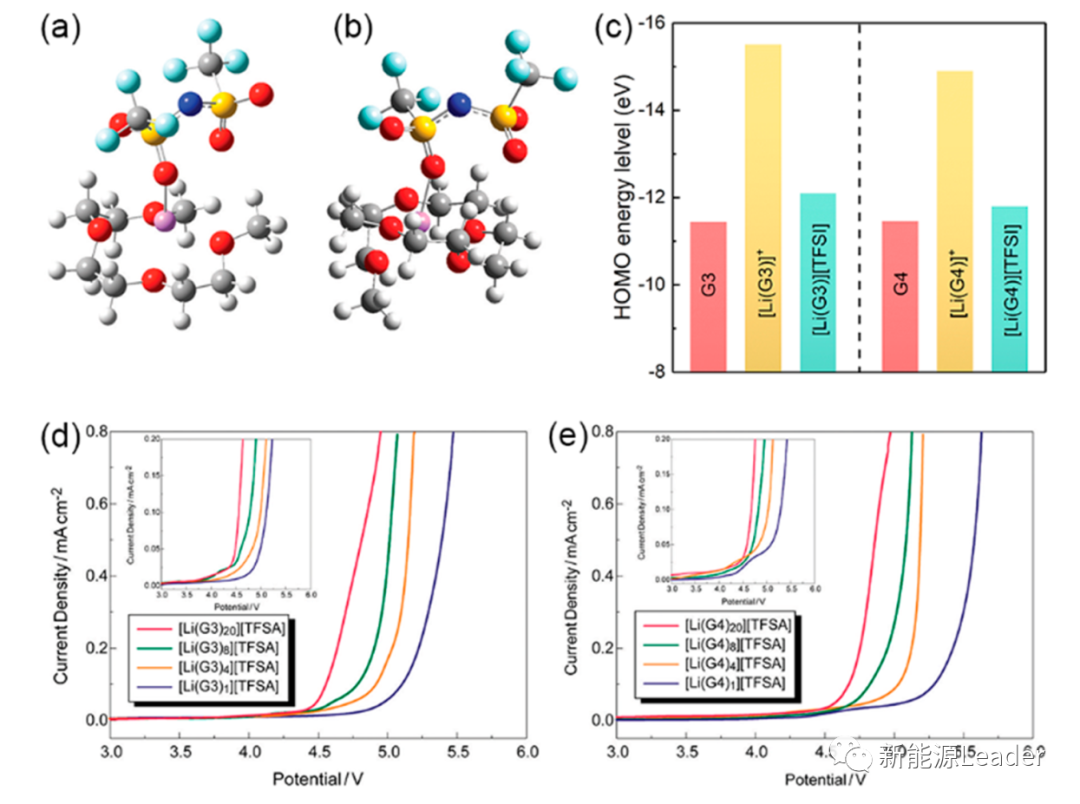 類似LUMO能量的變化,在溶劑分子與陽離子結合后,也會導致HOMO能量的降低,例如Li+與三甘醇二甲醚(G3)發生溶劑化后,G3的HOMO能量從-11.45eV降低到了-15.51eV,者能夠使得溶劑分子在正極一側時更難失去電子,從而提升電解液的氧化穩定性。從下圖d和e能夠看到隨著鋰鹽濃度的提高,電解液中自由溶劑分子數量逐漸降低,因此電解液的氧化分解電位也在逐漸提升。