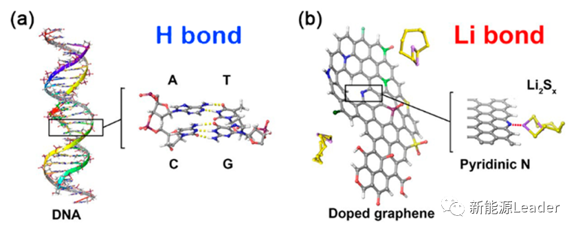 H鍵是廣為熟知的一種分子間強相互作用力,而研究表明在Li的供體和受體之間也會形成Li鍵。Li鍵理論的引入,為含鋰體系的研究提供了一種全新的視角,例如在Li-S電池中鋰的多硫化物能夠通過Li鍵固定在碳骨架上,從而減少了硫在正負極之間的穿梭效應。但是H鍵和Li鍵還是存在著顯著的區別的,例如H鍵更接近于共價鍵,但是Li鍵則主要是靜電特性,并且沒有方向性,因此Li鍵比H鍵的強度更高,同時Li在Li鍵中具有更好的分享特性,因此Li+能夠更好的在Li鍵中遷移。