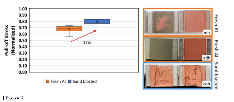 如圖2中所示,失效模式也可以從新鋁表面的粘合劑/混合式(adh/mix)切換到噴砂表面的粘結性失效(coh)。這一結果顯示,在測試垂直拉拔可再加工間隙填料時,定義基材表面粗糙度十分重要。