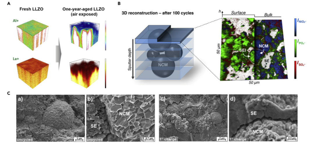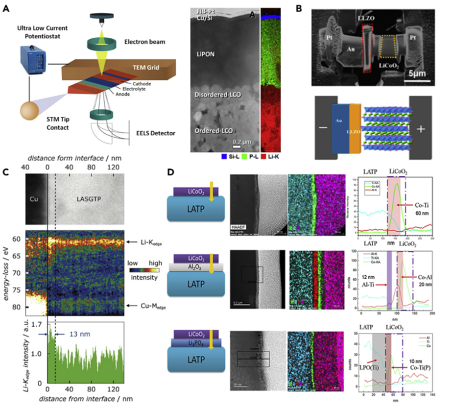 電極和固體電解質之間的界面化學反應以及由此產生的高界面電阻會嚴重影響固態電池的性能?梢酝ㄟ^納米成像、FIB和HRTEM等來表征化學反應所產生的形態、結構和化學性質的演變。