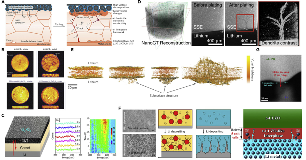 除了界面化學行為之外,物理接觸損失同樣會影響固態電池性能。原因可能與電解質本身的剛性、結構變化、體積膨脹和荷電狀態不均勻性等有關。掃描電鏡可以提供簡單的方法來觀察電化學循環期間引起的活性材料和固體電解質之間的物理接觸損失。X射線納米層析成像能夠實現高分辨率的界面可視化,以確定陰極-電解質界面演變的潛在機制。