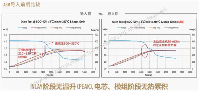 這里的假性熱失控,是指輝能的電芯在進行ARC測試(在近似絕熱的環境對被測樣品的放熱行為進行測試分析,反應接近于真實反應過程,能獲得熱失控條件下表觀放熱反應的動力學參數)過程中,出現的暫時溫度上升后便降溫的現象(上圖導入前部分),整個過程無熱失控風險。在導入ASM后,假性熱失控都不再發生(上圖導入后部分),“這樣各種高能材料在高度密集的封裝下也能無安全隱憂。”輝能相關負責人介紹道。