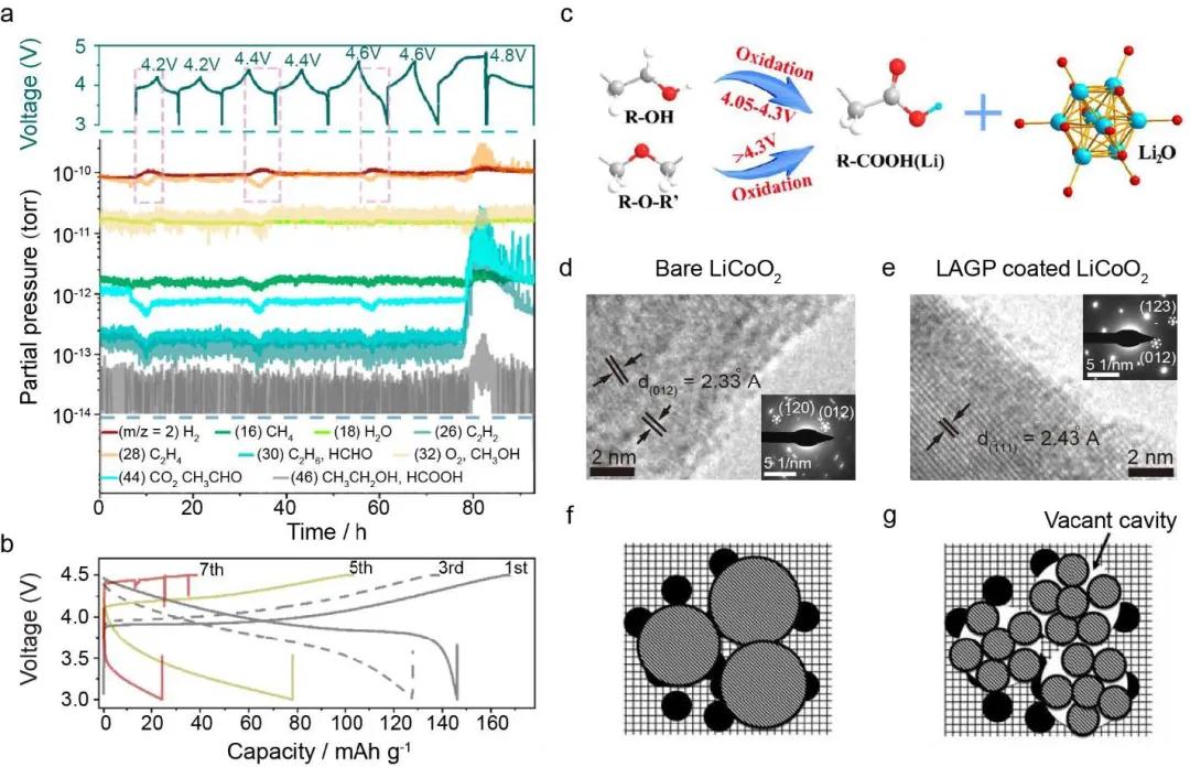 PEOPEO/4V正極界面的不穩定性主要源于PEO的氧化。近年來,人們對PEO氧化機理的研究表明,其氧化過程被認為是PEO的脫氫反應,生成強酸HTFSI,HTFSI不僅能攻擊鋰金屬,產生H2,而且能加速PEO的分解。另一方面,PEO氧化也會破壞固相。除了PEO和正極材料的化學/電化學穩定性外,固態PEO與正極之間的物理接觸也很重要。循環時正極粒子的體積變化可導致其從PEO電解質中分層(圖1f和g)。