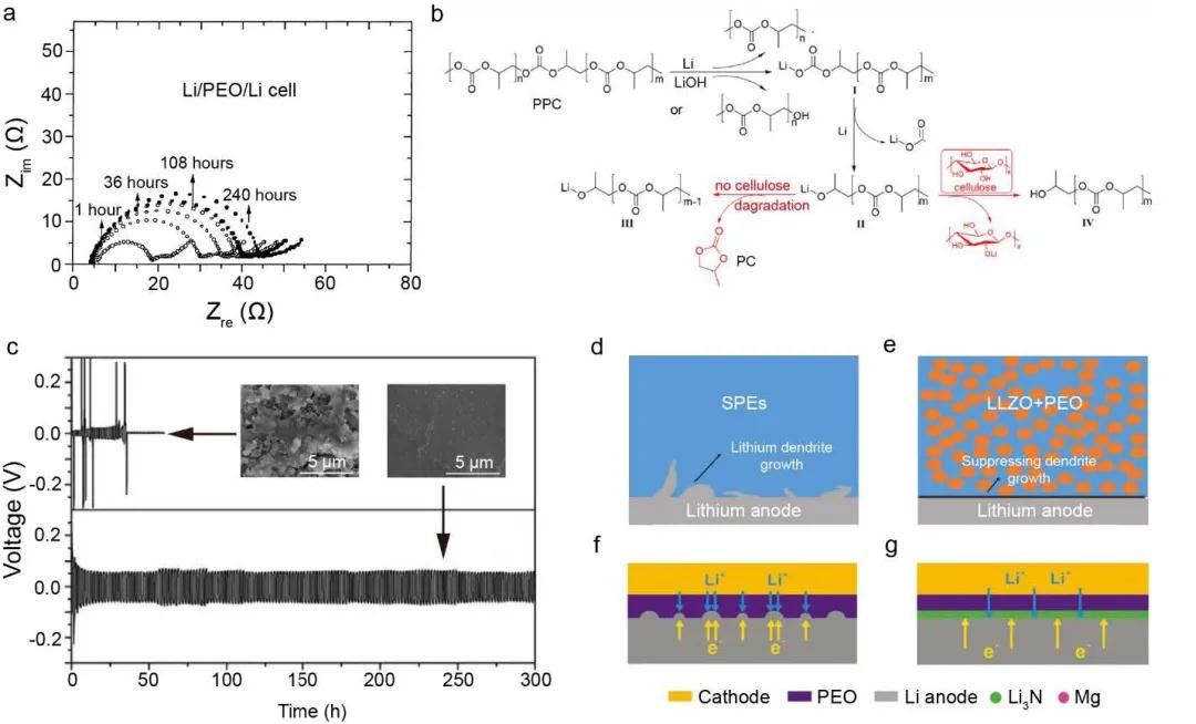 由于聚合物基電解質在循環過程中容易與鋰金屬發生化學反應,因此導致鋰負極/SPEs界面的降解。此外,鋰/聚合物界面的另一個重大挑戰是其機械脆弱性。由于聚合物電解質的剪切模量通常遠小于阻止枝晶生長的臨界值(1-10 GPa),在反復循環中不可控的枝晶生長和剝離將導致死鋰的形成,并促進聚合物電解質與鋰負極之間的副反應。