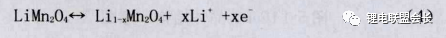LiMn2O4結構中,空的氧四面體和氧八面體以共面、共邊方式連接,這些空位構成了三維的鋰離子擴散通道,因而材料的導鋰性很好。其電極反應如式4所示。當發生鋰離子嵌入和脫嵌時,結構中錳原子能穩定立方密堆的氧,支撐起整個結構,所以尖晶石 LiMn2O4材料結構相對穩定。