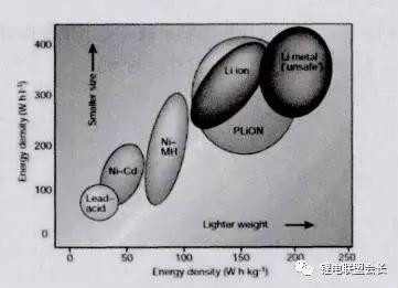 圖 1 不同類型電池的質量能量密度與體積能量密度分布圖