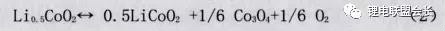(1)層狀LiCoO2結構中,鋰離子的可逆嵌入脫嵌量只有0.5個單元,多于0.5時,材料會發生不可逆的相變,造成容量衰減。所以LiCoO2的耐過充能力差,Li1-xCoO2中x的范圍為0≤x≤0.5,理論容量只有156mAh/g。此外,處于充電狀態的Li1-xCoO2 (x>0)在高溫下容易發生如式2所示的析氧反應,放出氧氣。