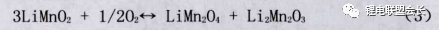 (3)層狀LiMnO2與層狀的LiCoO2結構略有不同,氧原子是以扭變的四方密堆方式排布,呈層狀巖鹽結構。理論容量為285mAh/g,但其循環性能較差。材料在脫鋰后結構不穩定,會慢慢向尖晶石型LiMn2O4結構轉變,此時鋰離子會進入錳離子層,造成容量衰減 。此外錳離子還容易與電解液發生副反應,進而溶解在電解液里。高溫時材料還 易發生如式3的反應,產生雜相。